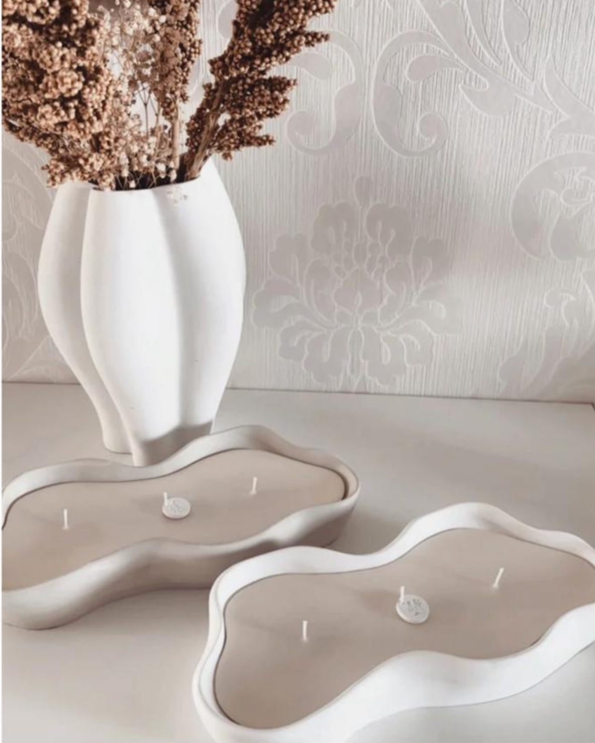 Wellenförmige 3-Docht-Kerzenschale in weiß oder in Beigetönen erhältlich.