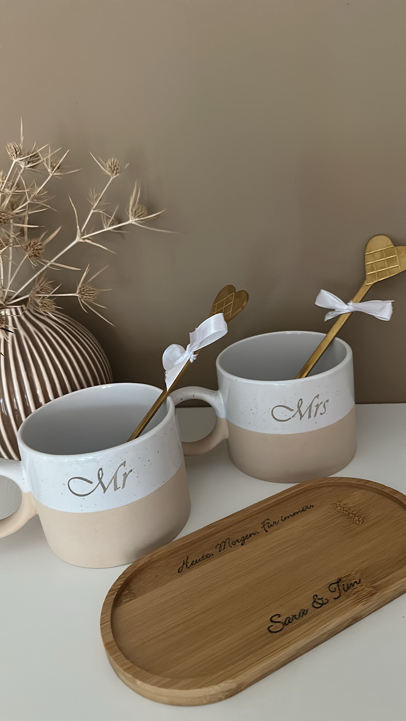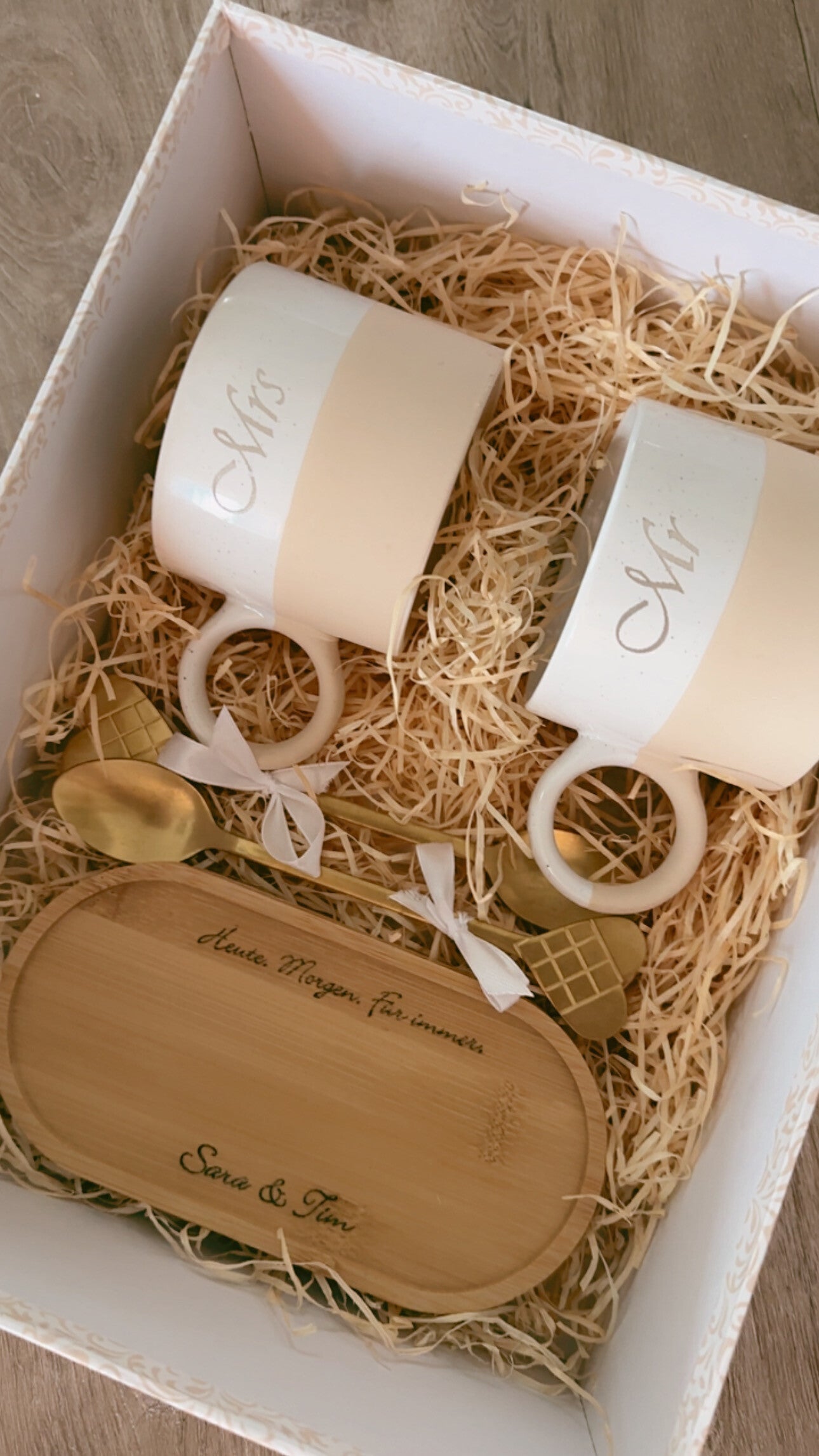 Geschenkset für besondere Anlässe bestehend aus 2 Weingläsern oder Kaffeebecher | -tassen mit kleinem Holztablett & 2 goldenen Herzlöffelchen. Jedes Set kann nach euren Vorstellungen graviert werden.